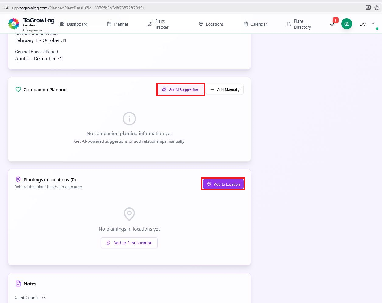 Then there is the Planting Location box where you can add your plants to the various Locations that might have already created so you can begin tracking your plants and creating Layouts.