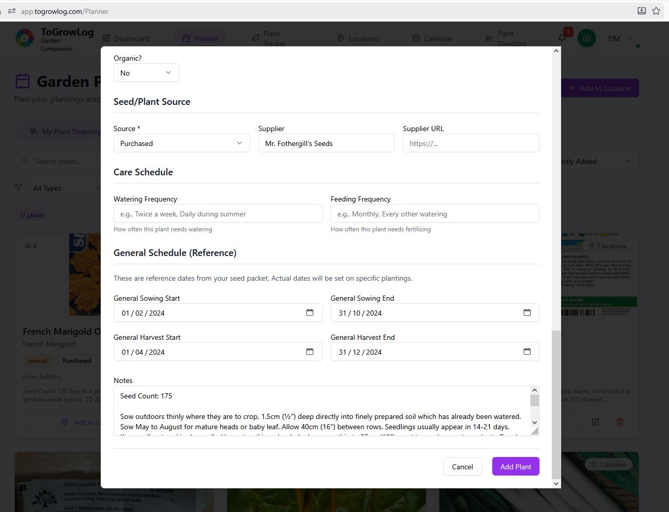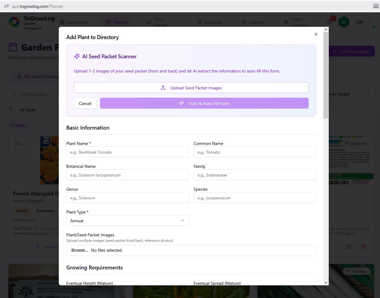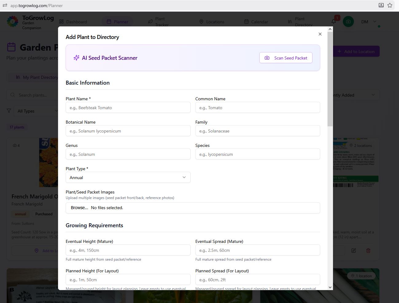 To begin planning for the new spring season with ToGrowLog you want to start adding some plants! Once logged in visit the “Planner” where you’ll see “My Plant Directory”, see the image below, the click “Add Plant”…