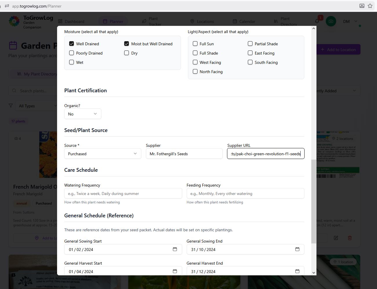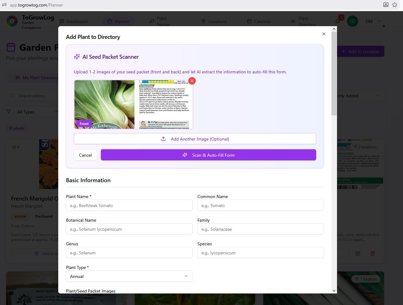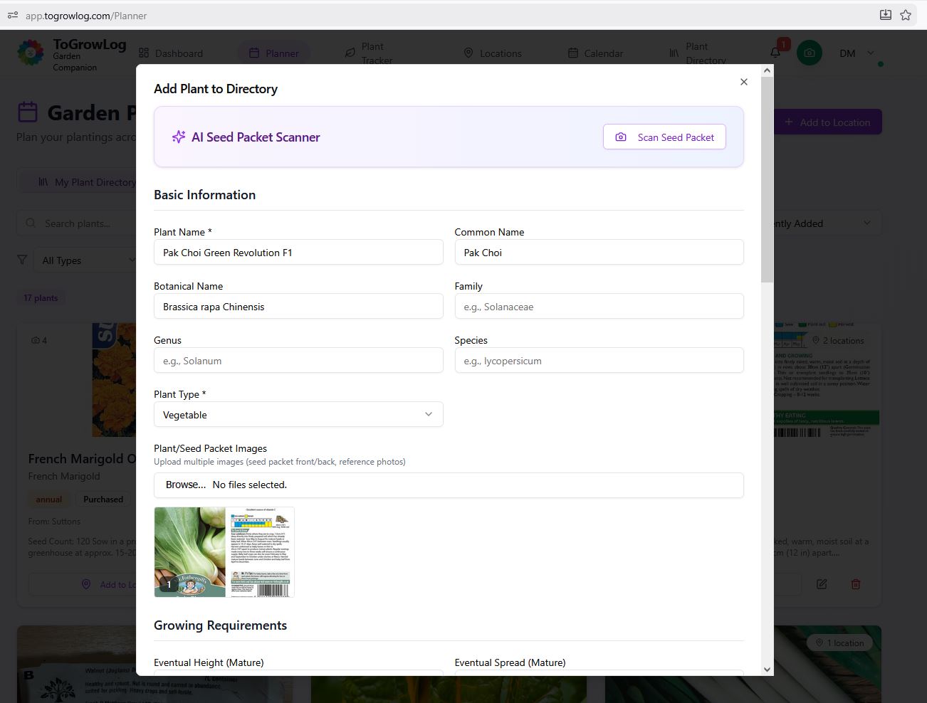 At the top of the form there is a purple box called “AI Seed PAcket Scanner, if you click the “Scan Seed Packet” button you’ll be able to upload the images you have saved of the of the seed packet, the AI can then read the details of the packet and filll out the vast majority of the form for you! Amazing 🙂