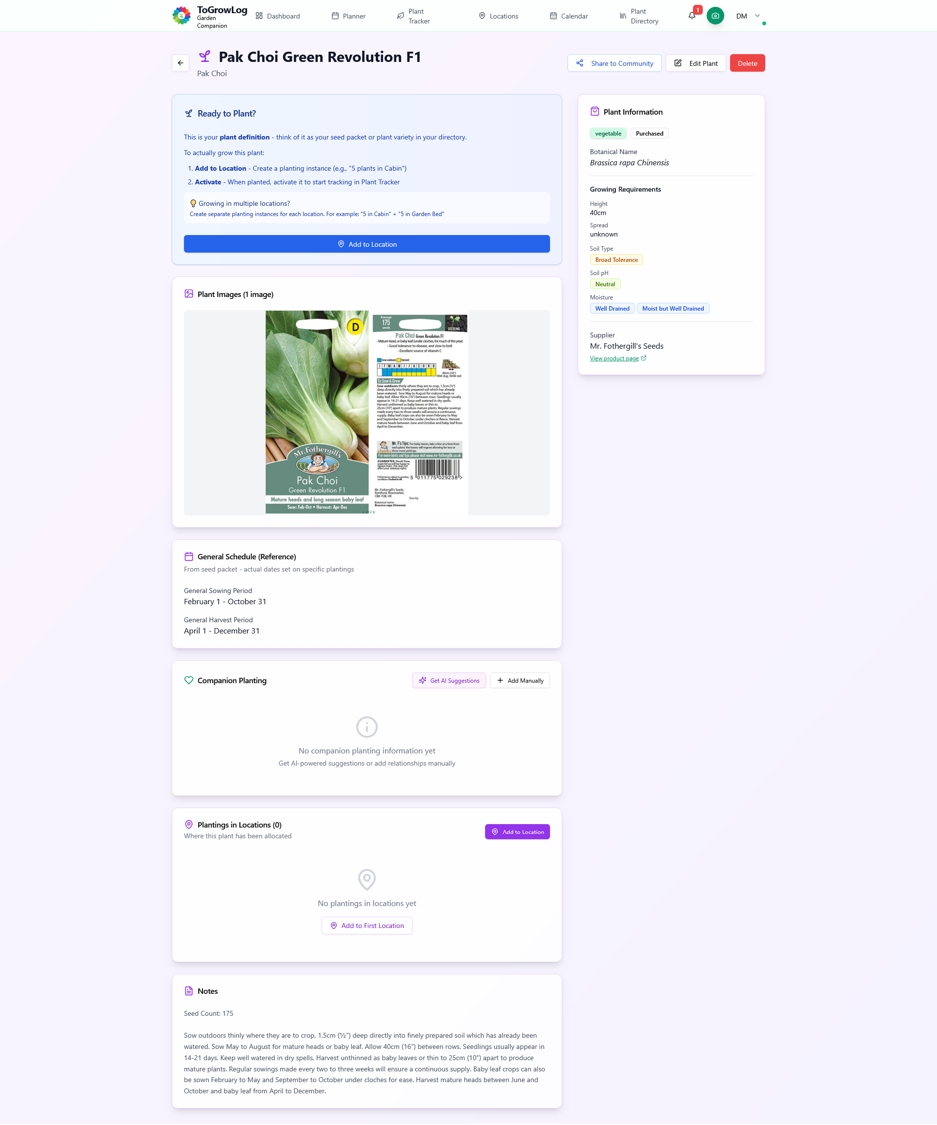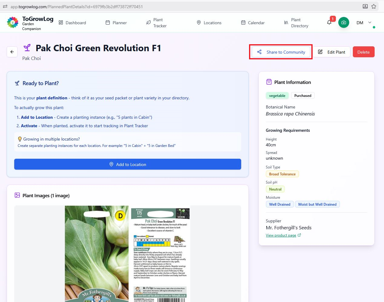 Once you’ve added your plant you’ll see on the completed plant screen that there are a few other options for you. Firstly you can contribute the plant to the Global Community Directory that we are creating. We hope that this Community Directory will become a great place for all us gardeners to add plants for others to also try growing.